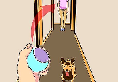 Play hide and go seek. If your dog knows the command “find it,” this can be a great game for indoors. To play, show your dog an object (usually one of its toys), then put your dog somewhere it can’t see you, like a bathroom, and go hide the toy. When you let your dog out, tell it to “find it.” Your dog will love using its skills to search for the hidden toy. If your dog is trained, you can also do this by telling it to sit and stay. Hide in another part of the house, then tell your dog to come. Call your dog a couple times in the beginning in case it doesn’t hear you, then reward it with a treat when he finds you! Make the game more and more difficult as your dog catches on. If your dog is having trouble locating the toy, use verbal clues to let it know when it is on the right track. For example, say “Good!” when your dog is getting close to the hiding spot. You can say something like “Uh-oh!” when it is heading in the wrong direction. You can also give your dog physical clues if it is having trouble. Try pointing it in the right direction or walking in the direction the toy is hidden. Get creative with your hiding spots because dogs will often check places they’ve found toys hidden previously. When your dog finds the hidden toy, praise it enthusiastically, making a very big deal that it has located the item.