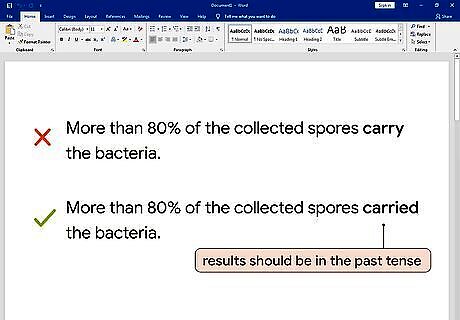 Use the past tense to record the results of your experiment. Since the experiment has already happened, the past tense is most appropriate for recording the results you found. Recording them in the present tense can be misleading or sound awkward. ✗ "More than 80% of the collected spores carry the bacteria." ✓ "More than 80% of the collected spores carried the bacteria."