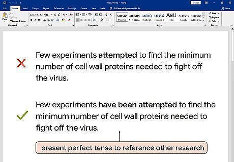 Use the present perfect tense to reference other research. If you’re noting another study in your introduction, the present perfect tense is more appropriate than the present or past tense. The present perfect tense addresses something that was just completed in the recent past and always uses the verbs “has” and “have.” ✗ "Few experiments attempted to find the minimum number of cell wall proteins needed to fight off the virus." ✓ "Few experiments have been attempted to find the minimum number of cell wall proteins needed to fight off the virus."