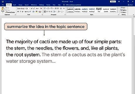 Summarize the ideas of the paragraph in the topic sentence. Think of the first sentence of each paragraph as a road map or guide to the information that follows. It may help to write a rough topic sentence and then go back to it after you've written the body of the paragraph. Take, for example, the sentence: "Potting soil made for succulents are particularly susceptible to Pythium insidiosum." It’s clear you'll be discussing succulent potting soil and Pythium insidiosum in the sentences to come.