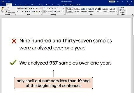Spell out numbers less than 10 and at the beginning of sentences. Scientific writing almost always includes numbers. If the number is less than 10, write it out (e.g., "eight" not "8"). If the number comes at the beginning of the sentence, write it out instead of using a numeral. Rephrase sentences starting with long numbers to avoid wordiness. ✗ "Nine hundred and thirty-seven samples were analyzed over one year." ✓ “We analyzed 937 samples over one year."