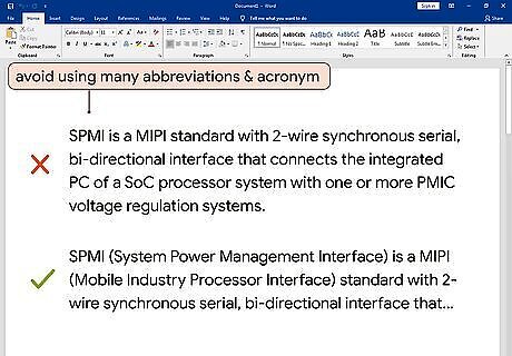 Limit the number of original abbreviations you use. Abbreviations like acronyms can prevent wordiness, but too many acronyms can be confusing and annoying (especially if the reader has to reference a previous page to recall what the letters stand for). Use a maximum of 3 to 4 abbreviations and make sure they're different to avoid confusion. For instance, avoid using "SPMI" and "SPNI" because the letters are so similar it might be confusing.