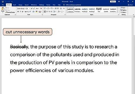 Cut unnecessary words to make your writing authoritative and concise. Flowery language and verbose prose might sound good in a novel, but it can dilute the effectiveness of scientific writing. Redundancies weaken your points and may cause the reader to doubt how confident you are in your assessments. The following words are almost always expendable: "Basically" "Fundamentally" "Totally" "Certainly" "Some"