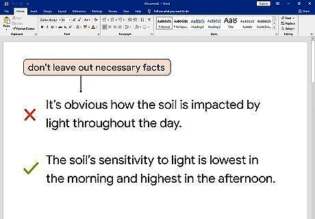 Don't over-edit your writing. While brevity is ideal, don't condense your writing to the point where you're leaving out necessary facts. Anticipate any questions the reader may have about your ideas and include that necessary information so they don't get lost or confused. ✗ "It's obvious how the soil is impacted by light throughout the day." ✓ "The soil's sensitivity to light is lowest in the morning and highest in the afternoon."