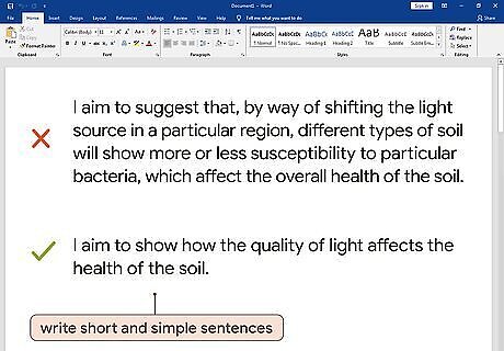Keep your sentences short and simple. Writing short sentences will help you organize your thoughts and make them more accessible to the reader. Run-on sentences can reflect murky thought processes and confuse your readers, so be brief and to-the-point. It's okay to have some longer sentences here and there, but sandwiching them between shorter sentences will increase the readability. ✗ "I aim to suggest that, by way of shifting the light source in a particular region, different types of soil will show more or less susceptibility to particular bacteria, which affect the overall health of the soil.” ✓ “I aim to show how the quality of light affects the health of the soil.”