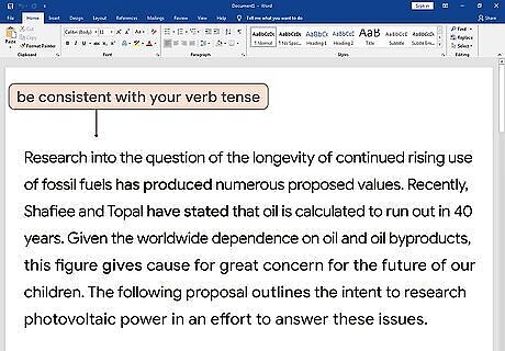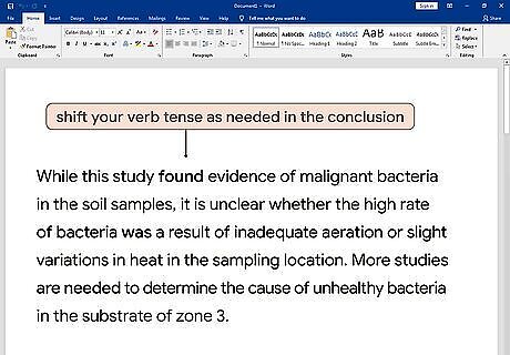 Shift your verb tense as needed in the conclusion. The concluding section of your paper will restate your key points and findings, point out any limitations, and propose future research on the matter. It's appropriate to shift between the past and present tense so it sounds natural. For example: "While this study found evidence of malignant bacteria in the soil samples, it is unclear whether the high rate of bacteria was a result of inadequate aeration or slight variations in heat in the sampling location.” (past) “More studies are needed to determine the cause of unhealthy bacteria in the substrate of zone 3." (present)