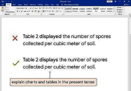 Explain charts and tables in the present tense. If you're using graphs or tables, explain the figures using the present tense since it's something readers are actively using to guide their understanding of the topic. Use 1 or 2 sentences and place the text directly under the diagram. ✗ "Table 2 displayed the number of spores collected per cubic meter of soil." ✓ "Table 2 displays the number of spores collected per cubic meter of soil."