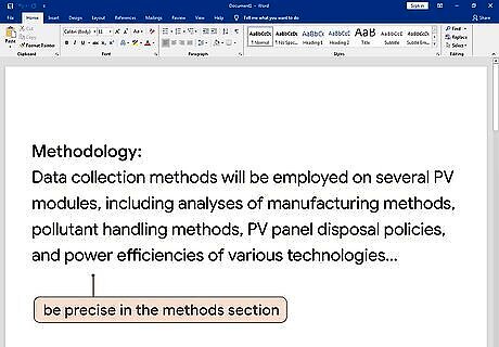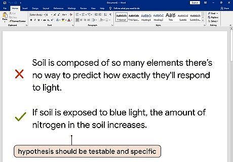 Craft an interesting hypothesis that’s testable and specific. Your hypothesis should come towards the end of your introduction. Think of it as the thesis statement or heart of your paper. A good hypothesis is testable, specific, and provocative (i.e., not boring or something that has already been proven or disproven). A good way to come up with one is to ask yourself a particular question and attempt to answer it. For instance: “How does the quality of light affect the quality of soil?” ✗ "Soil is composed of so many elements there's no way to predict how exactly they'll respond to light." ✓ "If soil is exposed to blue light, the amount of nitrogen in the soil increases."