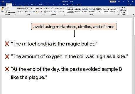 Refrain from using metaphors, similes, and cliches. Poetic language can add pizzazz to creative writing and some types of academic writing, but it doesn't belong in scientific writing. Metaphors, similar, and overused phrases will distract the reader from the points you're trying to make, weakening your paper. "The mitochondria is the magic bullet." (metaphor) "The amount of oxygen in the soil was high as a kite." (simile) "At the end of the day, the pests avoided sample B like the plague." (cliches)