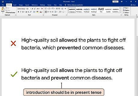 Write your introduction in the present tense. The introduction explains what your paper is about and why it's important. Since these are ongoing ideas, they should be written in the present tense. ✗ “High-quality soil allowed the plants to fight off bacteria, which prevented common diseases.” ✓ “High-quality soil allows the plants to fight off bacteria and prevent common diseases.”