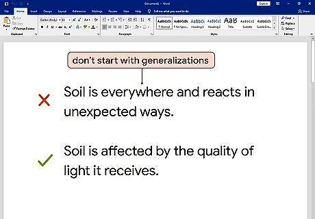 Don’t start your paper with generalizations. Get to the point of your paper right away instead of starting with broad ideas and addressing the specific topic later on. This will cut down on any unnecessary fluff, ensuring your paper is compact and direct. For instance, “Soil is everywhere and reacts in unexpected ways.” is a broad statement that doesn’t give the reader an idea of what exactly your paper is about. Instead, you might start with, “Soil is affected by the quality of light it receives.”