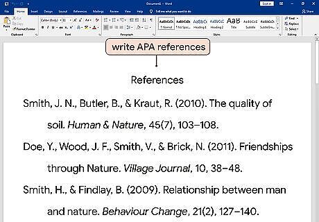 List all of your references alphabetically in APA style. Proper citations make it easy for readers to find the same information you found to write your paper. It also ensures the people who did those studies are getting recognized for their work. List them alphabetically by the author's last name. Use an online citation engine like BibMe, KnightCite, or EasyBib to expedite the process. Just be sure to check them afterward because citation generators aren't foolproof when it comes to capitalization and spelling. Stealing someone else's ideas isn't cool and may come with severe consequences, so be sure to cite properly.