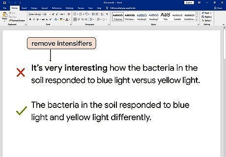 Remove intensifiers to avoid imparting an emotional tone. Words like "very" or "interestingly" will only weaken your writing and may invite your readers to doubt your claims. Intensifiers also instill your writing with an emotional tone, which can come off as disingenuous. ✗ "It's very interesting how the bacteria in the soil responded to blue light versus yellow light." ✓ "The bacteria in the soil responded to blue light and yellow light differently.”
