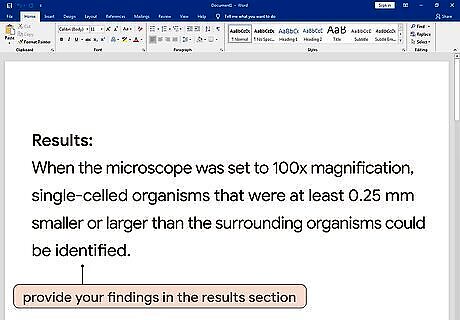 Provide your collected data in the results section. The results section is like a data dump but in written format, with tables, diagrams, or graphs added as necessary. Report all your findings in a logical order without any interpretation or bias. Use figures and tables alongside the text to organize your data so it’s easier for the reader to understand. Leave out any data that doesn't directly aim to answer your hypothesis. If it's a really cool finding that's slightly off-topic, pocket it for another study!