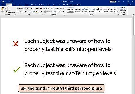 Use the gender-neutral third personal plural if necessary. Scientific writing is dominated by male pronouns, which can alienate or irritate certain readers. Instead of using "he," "him," or "his," when you're referring to a group of people that may also contain women, use "they," "them," or "their" instead. ✗ "Each subject was unaware of how to properly test his soil’s nitrogen levels." ✓ "Each subject was unaware of how to properly test their soil’s nitrogen levels.”