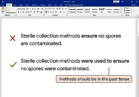 Discuss your methods in the past tense. The methods part of your paper is where you tell the reader what was done in the experiment, step by step. Since the experiment is not an ongoing practice, use the past tense throughout this section. ✗ "Sterile collection methods ensure no spores are contaminated." ✓ "Sterile collection methods were used to ensure no spores were contaminated."