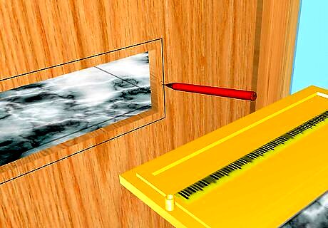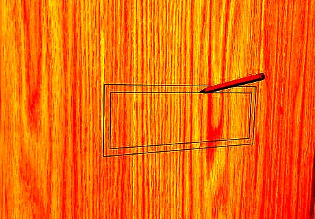 Hold the mail slot in position and trace around it with a pencil. Keeping the center points of the door and the mail slot lined up, align the bottom of the mail slot with the height marks you made earlier. Then use a pencil to trace the perimeter of the slot.