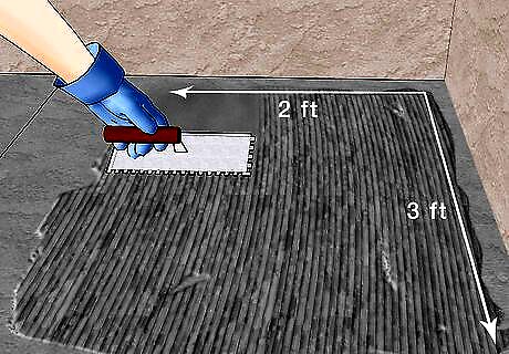 Spread your mortar. Spread mortar in a small area where you will begin to work. Only work with a roughly 2'x3' area at a time. You do not want the mortar to have time to set before you can lay your tile. Using a notched trowel (different sizes may be needed, 3/8" is a good starting point), spread the mortar between sections that you marked with the chalk line. If the mortar rises up between the tiles (to be flush or nearly flush with the tile surface), that means it's too thick or that the ridges need to be shorter. The mortar should be covering the entire tile, if you lift it up after placing it. If when you lift up the tiles you see only lines of mortar on the tile, then the mortar has dried out too much or the bed is too thin and the height of the ridges must be increased. If using tile sheets, use a trowel with smaller notches. This will keep the mortar from coming up through the gaps between the tiles.