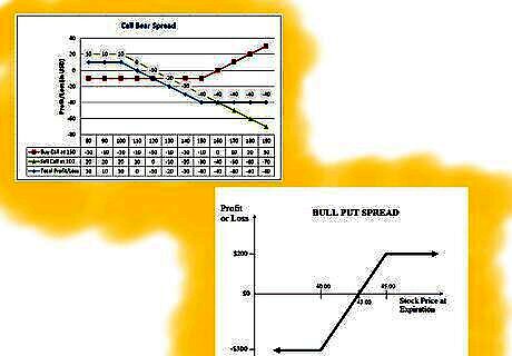 Choose either a bear call spread or a bull put spread. A bear call spread will be placed above resistance. A bull put spread will be placed below support. The goal of the spread is for the stock to stay neutral or bearish (decreasing) when placing a bear call spread (BCS) or for the stock to stay neutral or bullish (increasing) when placing a bull put spread (BPS). A spread above the current price is called a bear call spread (BCS for short). A spread below the price is called a bull put spread (BPS).