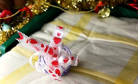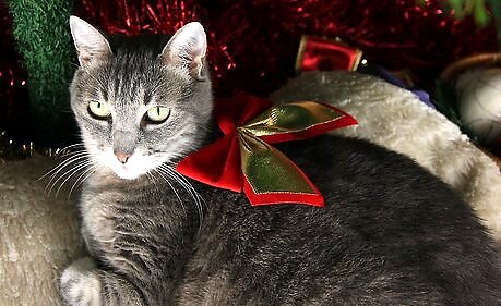 Give your pet a gift. While everyone is opening presents, give your pet a gift, such as a bone for a dog or a toy for a cat. It is also fun to wrap your gift for a dog, sometimes they will even unwrap it themselves. When wrapping a gift for your pet, make sure the wrapping doesn't have anything that could cut your animal’s mouth or that they may swallow. Tissue paper can be a safe alternative. If the gift is edible, try putting a bow on it, then removing it before giving it to your pet.