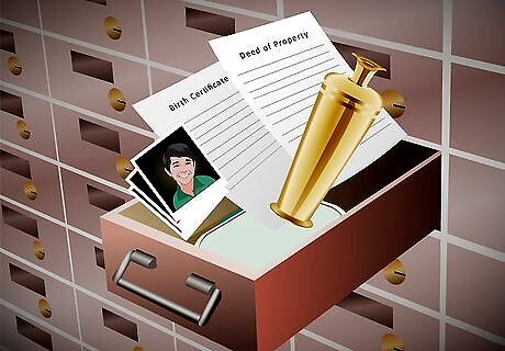 Store valuables in your box. Keep original valuable documents in your box, such as birth certificates, car titles, property deeds, and Savings Bonds. Family heirlooms that you do not want to display, copies of precious photographs, and collectibles may also be good candidates for safe deposit storage. Store anything you would want to restart your life if your house was destroyed. Consider storing images of your house and belongings for insurance purposes. Images can also be stored digitally. Consider making a secure website or emailing yourself images rather than putting them in your box.