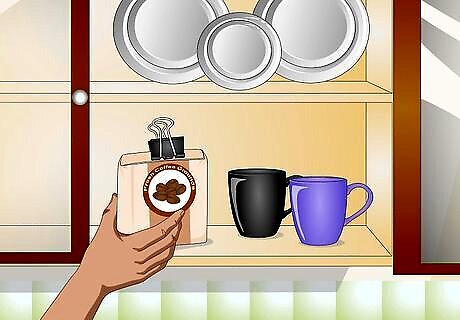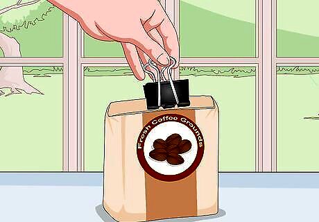Reseal the original coffee bag with a binder clip if you don't have a jar. If you want to use your original bag for storage, make sure to securely close it. Feel along the outside of the bag to find where the line of coffee beans or grounds start, and use long, upward motions to push any air out of the bag. Once you’re confident that the air is gone, tightly roll the top of the bag downwards. Push along the bottom of the bag to make sure that all of the air is gone before securing the rolled portion with a large binder clip. If your bag has an outside valve that allows air to escape, make sure that you keep it facing outwards when you roll the bag down. It doesn’t matter if the valve gets rolled up in the process. Place the original coffee bag inside a Ziploc bag for added protection.