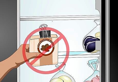 Avoid places with a lot of moisture. While it may be tempting to keep your coffee grounds in the refrigerator, this will only serve to damage the quality and freshness of the grounds. Since coffee has a tendency to soak in the scents and moisture of its surroundings, the fridge is not a good place to keep your grounds. Try to avoid keeping your coffee grounds in the freezer. While the freezer isn’t as much of a moisture treasure trove as a refrigerator, coffee grounds can still have their quality lowered by freezer burn. Since a freezer door is in motion fairly often throughout the day, there’s a chance that moisture from the regular air can still reach the grounds. The only exception when it comes to the freezer or fridge is if you’ve got unground beans and they’ve been vacuum-sealed so that zero moisture can get to the beans.