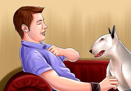 Keep your dog busy. With your dog facing you, keep your dog’s focus on you rather than on other dogs. Practice different commands, such as sit and lie down. Reward your dog after it follows each command. The commands and treats will keep your dog happily occupied until it’s time for the appointment. Along with treats, give your dog lots of verbal praise for focusing on you and following commands. Speak in a soft, calm voice so you do not excite or agitate other dogs in the waiting room. You could also pet your dog while it is facing you.
