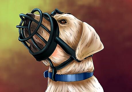 Muzzle your dog. If your dog is aggressive towards other dogs, putting a muzzle on your dog before entering the waiting room would be a good idea. Temporary use of a muzzle would help keep your dog and other dogs safe. The Baskerville (basket) muzzle is the most comfortable, since its design makes it easy for dogs to breathe. Soft muzzles, which are made of nylon, fabric, or leather, are also available. However, they are less comfortable than basket muzzles and make it difficult for a dog to pant. Talk to your vet if you are not sure which type of muzzle would be best for your dog. Train your dog to wear a muzzle before the vet visit. This way, by the time you will actually need to use it at the vet’s office, your dog will already be comfortable with it.