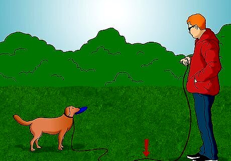 Play Fetch. Playing fetch is a fun way to ensure your dogs gets regular exercise. Most dogs, especially retrievers or other sporting breeds, will fetch balls, sticks, and toys without even needing to be trained. Other dogs can learn to play with very little effort. Some people find it difficult to play this game because of local leash laws or disobedient dogs that would run away if unleashed. Fetch leashes are available, however, for this purpose. They're made of strong materials, such as Kevlar, and come in 25ft, 50ft or even 75ft sizes. If you can't find a leash that long, or if you want an extra long leash, simply tie two or more leashes together. with a long leash, a dog can safely run after a ball, stick or Frisbee while remaining under control and obeying leash laws. this allows a dog tremendous freedom in a controlled environment.