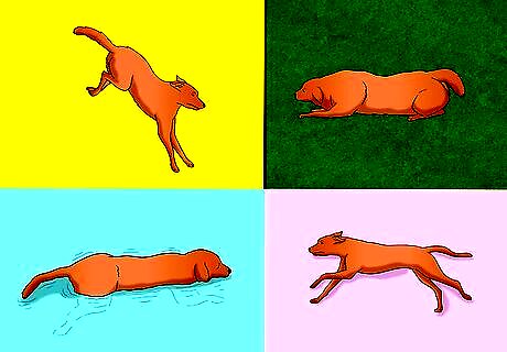 Talk to your vet about strength training with your dog. Most owners don't think of strength training a dog, but it's sometimes appropriate for medium-sized or large dogs who are healthy enough to do it. It's especially effective with working dogs. Dogs can be fit with weighted harnesses or be latched to light wagons or sleighs. Walking or doing light activity under load for short amounts of time can strengthen the dogs muscles, just like a work out at the gym. Again, be certain to check with a vet before attempting this type of exercise and never put the dog under too much weight or stress the dog for long amounts of time.