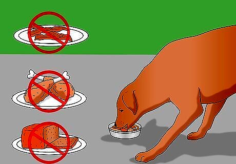 Don't feed dogs table scraps. The number one way to get your dog out of shape? Too many bites from the table. Even though it's tempting to give the pet little bacon bits and other food bites, those calories add up and the high salt and fat content can be chaotic on a dog's digestive system. Keep the people food for the people. Feed your dog high-quality dog treats, instead of providing chicken bones or other "human" treats. Sow ears, rawhide chews, and dental bones are all better choices than a ham hock. If your dog is a bigger when you're eating, don't give in. Instead, work on training your dog not to beg.