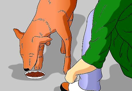 Make your dog work for their food. The best dog trainers hand-feed their animals, doling out bits of kibble as rewards for sits, stays, comes, heeling on the leash, or helping reinforce clicker training. If you don't have this kind of time though, you can increase the amount of time and energy the dog spends eating. Try doing a kibble treasure hunt. Throw the dog kibble into long grass. That way, the dog has to spend some time rummaging around for it, rather than just bolting it down in two seconds flat. Put food in rubber toys. Freezing beef broth or peanut butter inside toys can provide hours of entertainment, thereby lowering stress levels, and helping your dog feel full.