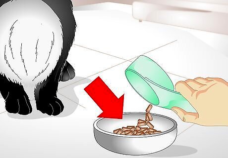 Limit your rabbit's intake of rabbit pellets. In general, pet rabbits do not need to eat pellets. They are typically high in calories and low in fiber. Those extra calories can lead to obesity, which is an extremely common problem in pet rabbits. If you have already made pellets a part of your rabbit's diet, make sure the pellets are plain (e.g., no seeds, nuts, extra coloring), high in fiber, and low in protein. Your rabbit's daily pellet portion depends on his weight. For example, a 7 to 10 pound rabbit should eat 0.5 to 0.75 cups of pellets per day. Measure the amount with a dry measuring cup.