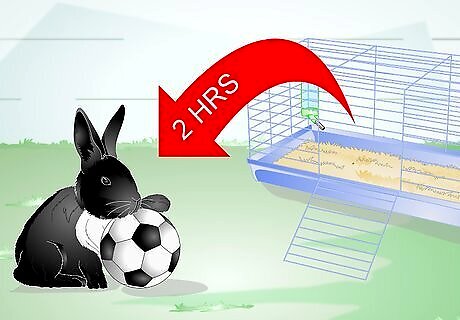 Schedule daily playtime. Daily exercise is essential to keeping your rabbit slim. Your rabbit should have about 2 hours of exercise at the least outside of his cage each day (less if you keep him in a large, spacious cage). If you exercise him indoors, 'bunny proof' the area—remove any electrical cables, houseplants, or other hazards your rabbit could chew on. For an outdoor exercise area, block any potential escape routes, and keep your rabbit away from areas with pesticides or fertilizers. Place your rabbit in a large exercise pen outside so he will be safe from predators.