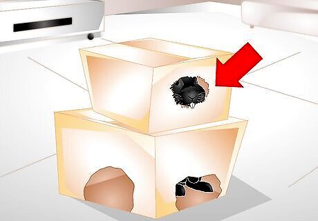 Create an obstacle course for your rabbit. Whether you play with your rabbit inside or outside, make an obstacle course out of various household items (e.g., cardboard boxes and different pieces of furniture). Place these items throughout the play area for him to run around. On the boxes, remove the flaps and cut out large holes to give your rabbit something to run through. Consider placing a treat at the end of course so he can reward himself at the end. Make yourself a part of the obstacle course by temporarily blocking your rabbit's forward movement and making him run around you.