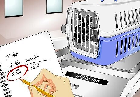 Weigh your rabbit. Use a scale to weigh your rabbit at home. If he will not sit still on the scale, weigh his carrier on the scale, then put him in the carrier. Subtract the weight of the carrier from the weight of your rabbit plus the carrier. For example, if the carrier weighs 2 pounds, and putting your rabbit in the carrier takes the weight up to 10 pounds, then your rabbit weighs 8 pounds. Monitor your rabbit's weight regularly (preferably a few times a month). Compare his current weight to his normal weight to see if he has gained weight.