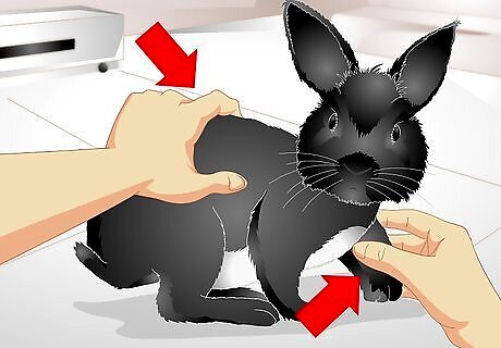 Examine your rabbit's body condition. Looking at your rabbit's body as a whole is a helpful way of determining if he is slim or overweight. A slim rabbit should have a curve from neck to tail and hip to hip. If you have a female rabbit, her dewlap (fold of fur below the chin) should feel like a fold of skin, rather than a roll of fat, when pinched. From the top looking down, a slim rabbit should have a visible waist. When you touch your rabbit, you should be able to easily feel his spine and hips, but their edges should not feel sharp. Rather, the edges should feel round, indicating a sufficient, but not excessive, fat covering. An overweight body condition consists of a fatty dewlap for female rabbits, the presence of a dewlap for male rabbits (male rabbits shouldn't have a dewlap), and fatty pads around the shoulders, legs, and genital area. Be aware that rabbits have a lot of fur, which can make it difficult to determine body condition. If you are unsure about your rabbit's body condition, ask your veterinarian how to do a proper body condition examination.