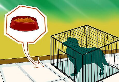 Feed the dog in the crate. Start by feeding the dog a few times in the crate, and leave the door wide open. At first, put the food bowl halfway into the crate, so the dog can eat with his body half in and half out of the crate. Gradually move the food to the back of the crate. Once the dog willingly stands inside the crate to eat the whole meal, reach in and move the food bowl to the front of the crate. When the dog turns to face you, close the door halfway. Let the dog continue to go in and out of the crate as he eats. You want to move the bowl so that you are not closing the door behind him. If he is facing you to eat, he can see what you are doing.