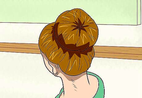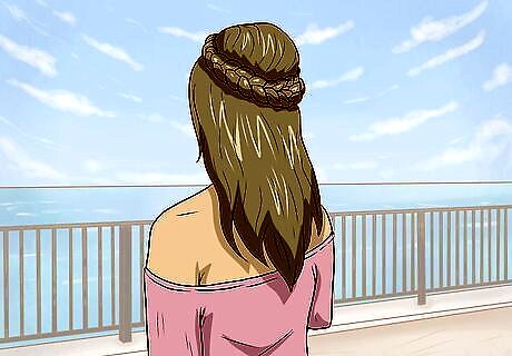 Try a ballerina bun to stay cool. Pull your long hair up into a high ponytail and secure it with an elastic hairband. Twist the ponytail around the base and secure it with bobby pins that match your hair color. For an extra sleek look, do this when your hair is damp and spray it with a texturizing spray before pulling it up. If your hair isn’t quite long enough to twist into a bun, achieve the look with the help of a hair donut, available at accessory and beauty supply stores.