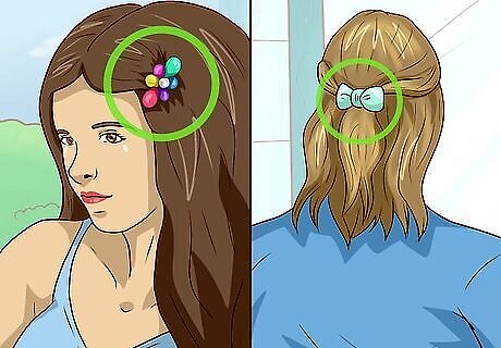 Pin your bob up with cute clips and barrettes. If you have a haircut that’s too long to slick back but too short to put in braids or a bun, invest in some cute clips or barrettes. Experiment with how to wear them by clipping the sides of your hair up and away from your face, or twisting small sections from all around your head up and against your head then securing them with bobby pins and a few strategically placed clips.