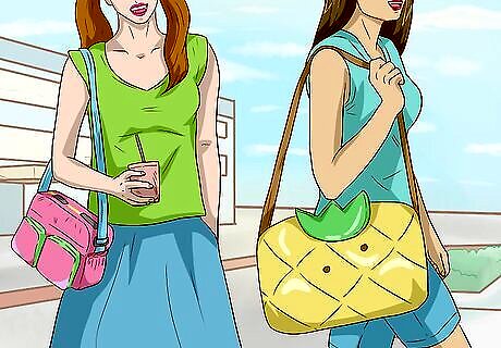 Carry a tropical-themed handbag. To tote all your summer essentials, try a small brightly colored handbag with palm tree or tropical fruit print. Bright animal prints and neon colors also tend to be popular in the hot months.