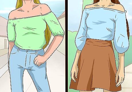 Try an off-the-shoulder blouse instead of a tank top. While tank tops are always in style for summer, women can make an extra effort to look cute by trying an off-the-shoulder blouse instead. Look for one made from light, flowy material and bright or pastel colors for your next summer event. Wear these blouses with a skirt and heels or ballet flats for a dressier occasion, or with cutoffs and flat sandals or sneakers to a casual event.