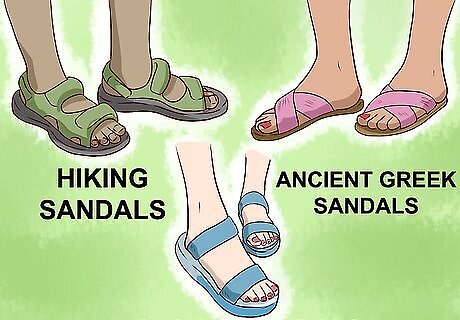 Invest in comfortable sandals. There are hundreds of sandal options to choose from for both men and women, but you will want to find ones with enough support to wear them out for various lengths of time. Consider sports sliders or hiking sandals for casual wear, or Greek style sandals for dressier events. Women can look extra cute by pairing sparkly or flowered sandals with their favorite romper or maxi dress. Sandals with a slight heel can also make any outfit look dressier.