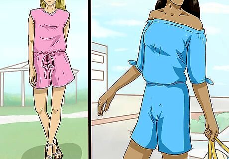 Choose a romper for any casual occasion. A colorful romper is a perfect choice for women to look cute in hot weather because there are no buttons or zippers rubbing against your sweaty skin. Find one that’s loose but short, with the legs ending at your upper thigh. Wear your romper with a pair of flat sandals to any casual summer event.
