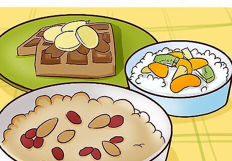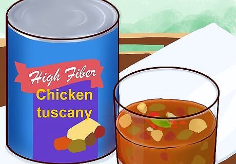 Eat a nutritious breakfast to fuel yourself during the day. When you're following a canned soup diet, you're most likely not replacing breakfast with soup. If you're not, plan a nutritious, "diet-friendly" meal to keep you on track with your weight loss. Eating a healthy breakfast will boost your energy and may help reduce the temptation to overeat later in the day. It's typically recommended to have a high protein, high fiber breakfast. Both protein and fiber keep you feeling satisfied longer and will support your weight loss. Examples of high protein, high fiber breakfasts include: 1 whole-grain waffle with 1 tablespoon (15 mL) of almond butter and 1/2 a banana, 3/4 cup (about 60 g) of oatmeal with dried fruit and nuts, 2 scrambled eggs with sautéed vegetables, and low-fat cheese or 1 cup (225 g) of cottage cheese and fruit.