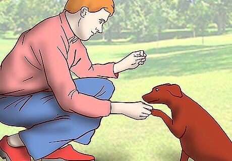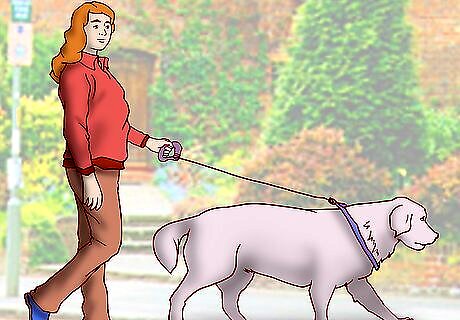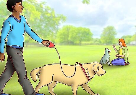 Walk your dog. Another way you can socialize your dog is to take them for a walk. Walking around a park, neighborhood, or trails with people and other dogs helps socialize your dog. Exposing your dog to these areas puts them in contact with a lot of different people and dogs. After your dog gets used to just being around people, try introducing him to people. Notice the people who pass you. If someone smiles and comments on your dog, ask them, "Would you like to meet him? He's learning how to interact with people." Avoid people who look aggressive or who are walking aggressive dogs.