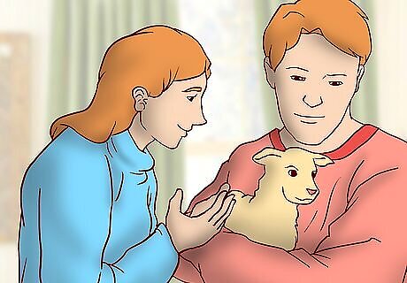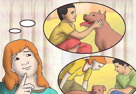 Let your dog interact with different kinds of people. You may want to make a point to introduce your dog to different types of people. This helps your dog to get used to everyone. Start with your friends and family, then try to walk by different people while out. For example, you may want to let your dog interact with people of different ages. Let your dog see people who use canes or wheelchairs. Let them be around people with facial hair and different color hair. Introduce them to people of different ethnicities. Bring your dog around people who are engaging in different activities, like running, playing sports, singing, or laughing loudly. You may want to let them be around people wearing different clothes.