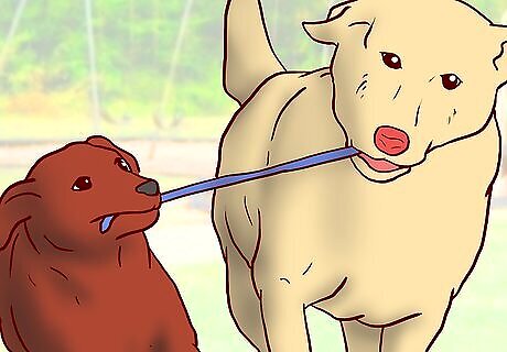 Arrange playdates with other dogs. Dogs are social animals that need to be around other people and dogs. One way to help with this is to let your dog play with other dogs. You can arrange a playdate for your dog and the dog of a friend, family member, colleague, or neighbor. This helps your dog be around other dogs and people. Start with dogs that your dog knows. This may be a neighbor's dog or a family members dog. You may also ask for a playdate with a dog your dog knows from the dog park. You may say, "My dog is learning social skills and really gets along with your dog. Could we arrange a playdate for our dogs?" If you are arranging a playdate with a neighborhood or family dog, ask for the playdate to happen in your yard. Explain to the owner that you are teaching your dog social skills and you think being in your dog's yard will help. Stick to dogs that your dog knows or are familiar with at the beginning. Even if your dog and a dog at the dog park don't know each other well, if they have been around each other and interacted, this makes them familiar enough to interact. Your playdate can be as simple as letting the dogs run around the yard together. You may want to bring out some toys and have them chase balls or frisbees.