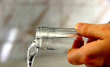 Hold a spoon upside down inside the glass, just above the Kahlua. The tip should be touching the wall of the glass, just above the Kahlua. The handle of the spoon should be resting on the rim of the glass. The dome of the spoon should be facing upwards. Some people find that it is easier if the spoon tip is just touching the Kahlua. Other people find it easier if it is just above it. Use whatever works best for you.